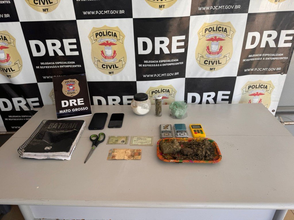 Durante as buscas no local, os policiais apreenderam uma tigela com vários pedaços de maconha, um vidro com flor de maconha, duas balanças de precisão, além de uma tesoura com resquícios de entorpecentes, máquina de cartão, dinheiro, dois aparelhos celulares e um caderno de anotações com a contabilidade da droga.