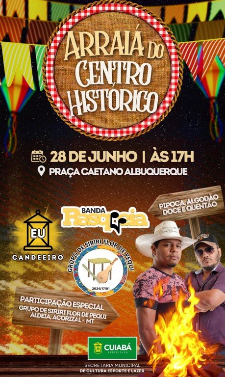 A programação do projeto ‘Eu Candeeiro’ desta semana está um pouco diferente. Aproveitando o ritmo das festanças juninas, será realizado nesta sexta-feira (28), a partir das 17h, o Arraiá do Centro Histórico, na praça Caetano Albuquerque. O projeto, promovido pela Prefeitura de Cuiabá por meio da Secretaria Municipal de Cultura, Esporte e Lazer, tem como principal objetivo aproximar a população da região central, promovendo o fortalecimento do ambiente de convivência, bem-estar e lazer no Beco do Candeeiro.
