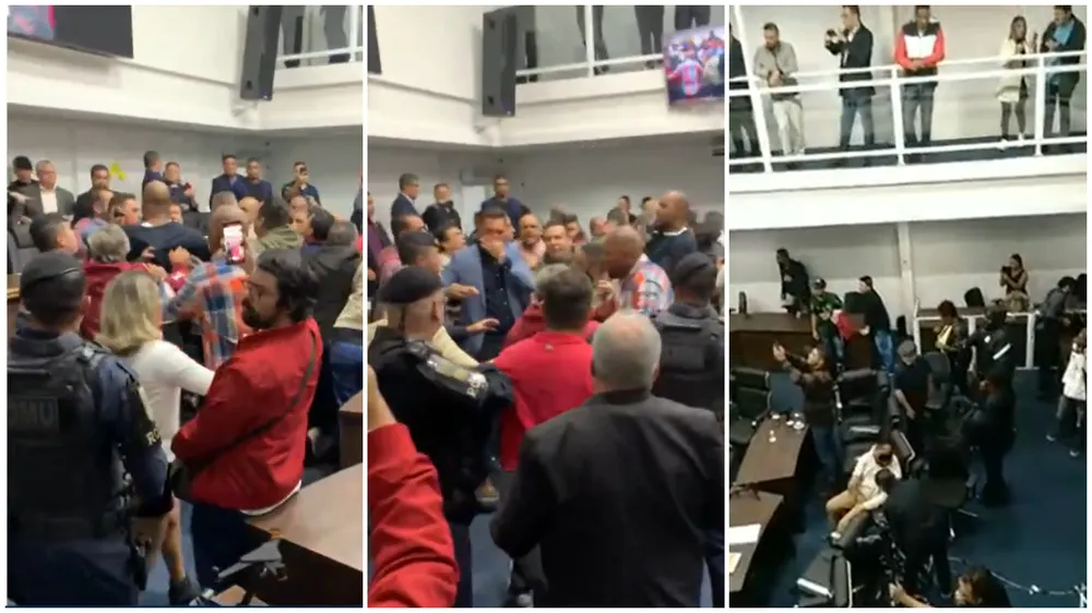 Uma audiência pública na Câmara dos vereadores de Taboão da Serra, na Grande São Paulo, terminou em pancadaria e confusão generalizada na noite desta quinta-feira (28).