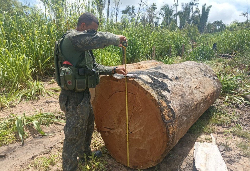 Em uma ação integrada durante a Operação Amazônia, os militares receberam informações de fiscais da Secretaria Estadual de Meio Ambiente (Sema), acerca de um desmatamento em floresta nativa, na região do distrito de Conselvan. Ao se deslocarem para área, as equipes localizaram os maquinários e as toras espalhados por diversos pontos da área desmatada.