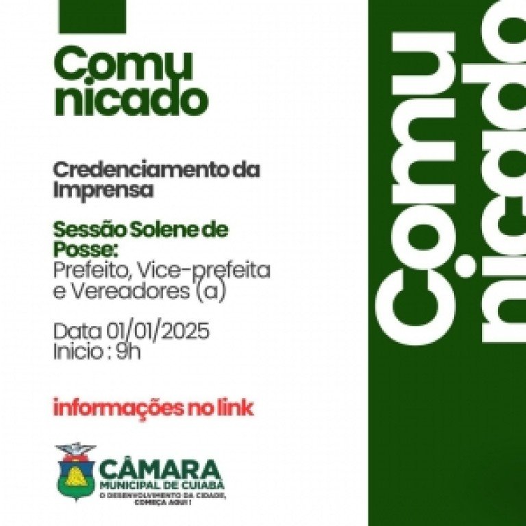 Informamos que os veículos de comunicação que farão a cobertura do evento deverão estar devidamente credenciados, com seus nomes confirmados, junto à Secretaria de Comunicação da Câmara Municipal de Cuiabá.
