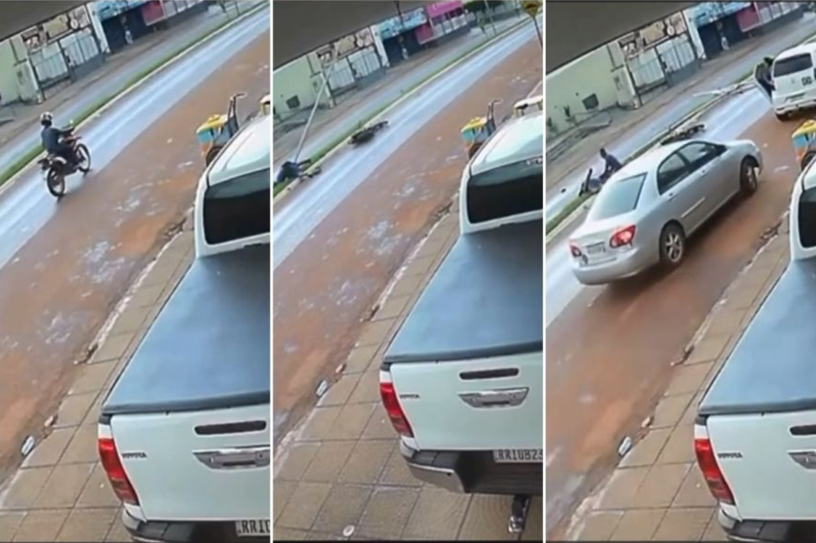 Uma câmera de segurança flagrou, na tarde do domingo (23), o momento em que um motociclista, ainda não identificado, perde o controle e colide com um poste, na cidade de Peixoto de Azevedo.