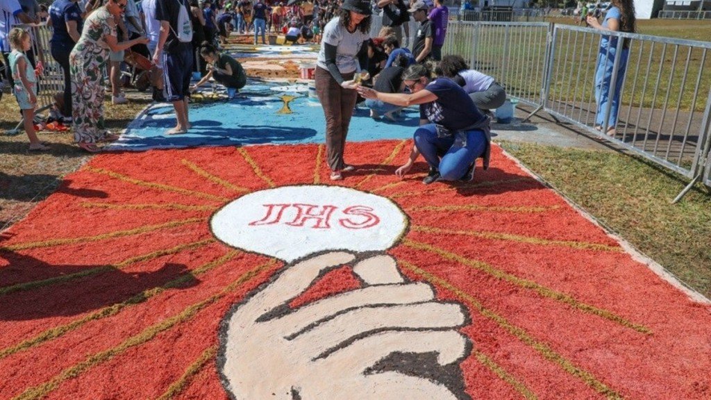 “Essa é uma festa muito importante para a gente, que é a eucaristia. Com o passar do tempo, a igreja foi olhando para essa solenidade com muito amor. A eucaristia é a centralidade da nossa fé. A temática dos tapetes é sempre a eucaristia. A montagem já é uma oração. É um momento de renovação da fé, de agradecer a Deus e reverencia-lo com o nosso trabalho. Para a gente, a eucaristia não é apenas um pão, é Jesus Eucarístico” , explicou Cássia Renata, 31 anos, da Congregação Apóstola do Sagrado Coração de Jesus.