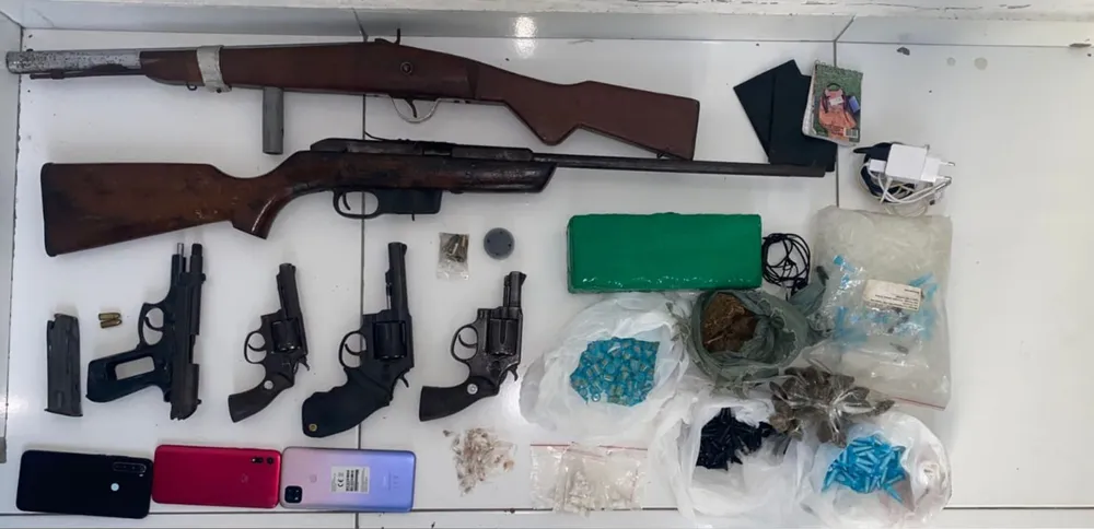 Na ação, no interior do estado, foram apreendidos uma espingarda de fabricação artesanal, um rifle calibre 22, três revólveres calibres 38 e 32, uma pistola Taurus calibre 765, um saco, um tablete e 43 porções de maconha, 127 pinos de cocaína e 121 embalagens contendo crack.