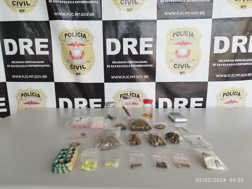 Na região central de Várzea Grande, os investigadores cumpriram um mandado de busca e apreensão expedido pelo juízo da comarca e prenderam um suspeito de comercializar entorpecente. Durante o cumprimento da ordem judicial foram apreendidos diversos comprimidos de droga sintética, maconha em extrato e balança de precisão.