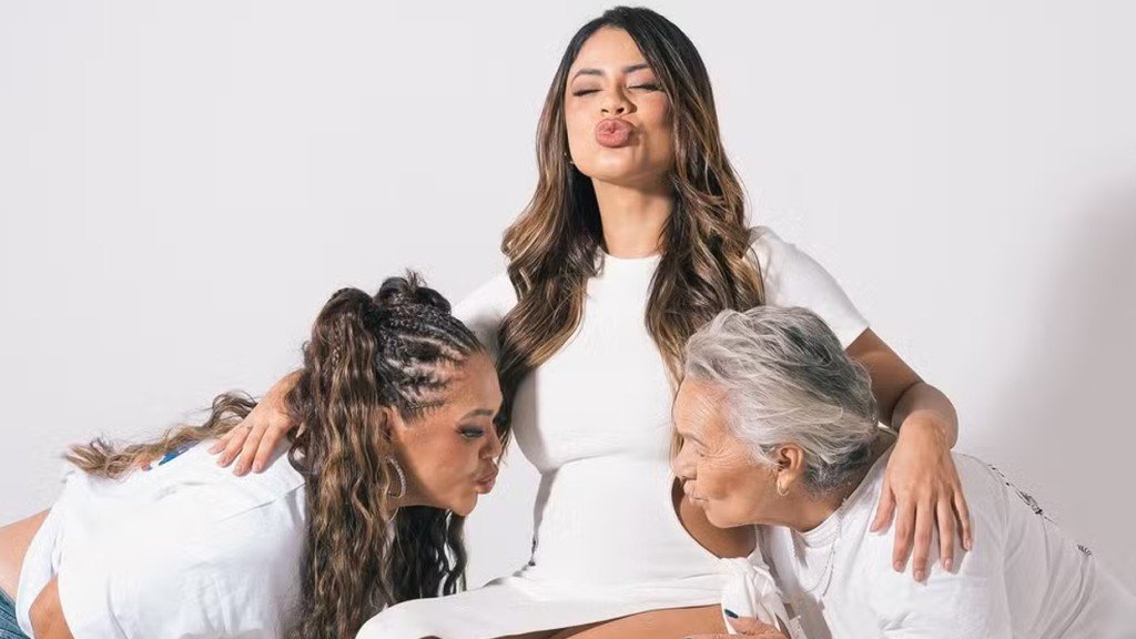 Na imagem postada, ela e a sua mãe, Conceição Araújo, aparecem beijando a barriga da cantora. “Vem que vem, pois estamos ansiosos pra te cheirar, beijar e mimar muito!!! Vovó já te ama. Imagina sua bisa, Conceição”, concluiu.