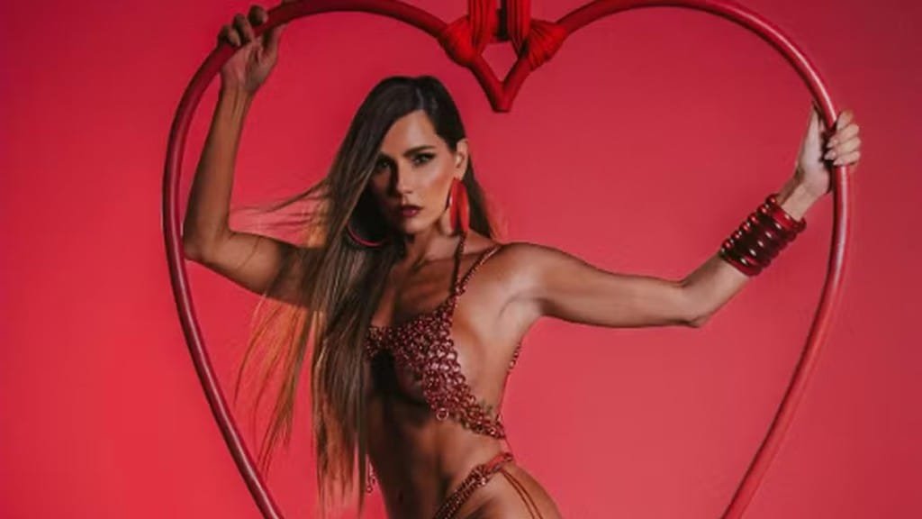 No registro, ela posou poderosa com um look carnavalesco revelador, feito de argolas, com um super decote nos seios. A calcinha era feita de correntes vermelhas, no estilo fio dental, deixando sua marquinha de bronzeado em evidência nos registros.