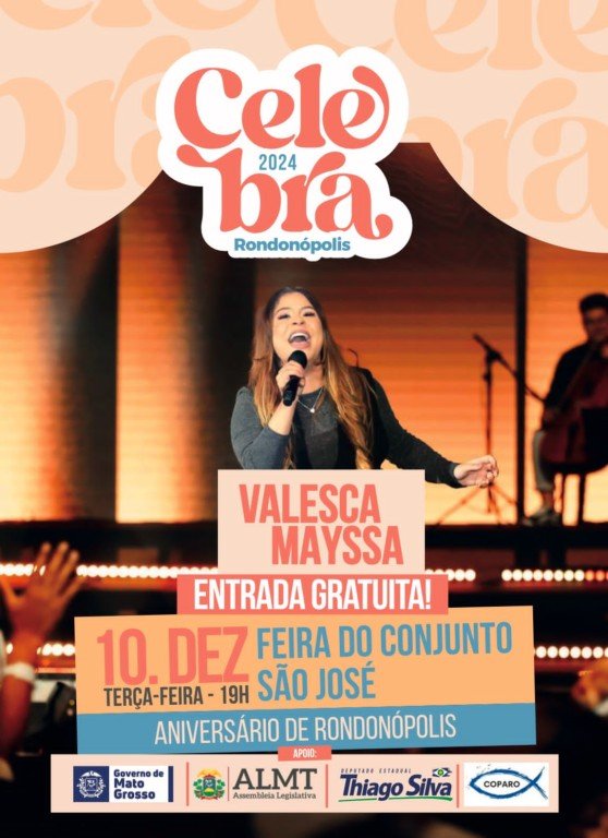 Rondonópolis comemora o seu aniversário com a segunda edição do “Celebra Rondonópolis”, no dia 10 de dezembro, às 19h, na feira do Conjunto São José, com a participação especial da cantora gospel Valesca Mayssa. O evento vai proporcionar uma noite de adoração e louvor para toda a comunidade, sendo uma proposta idealizada pelo deputado estadual Thiago Silva (MDB), com o apoio do Conselho de Pastores, da Assembleia Legislativa e da Secretaria de Estado da Cultura de Mato Grosso (Secel).