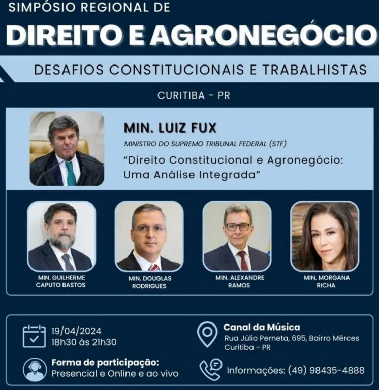 Curitiba sediará, no dia 19 de abril, o Simpósio Regional de Direito e Agronegócio – Desafios Constitucionais e Trabalhistas. O Simpósio terá como tema: “A constitucionalização do Direito do Trabalho: Impactos no Agronegócio”.