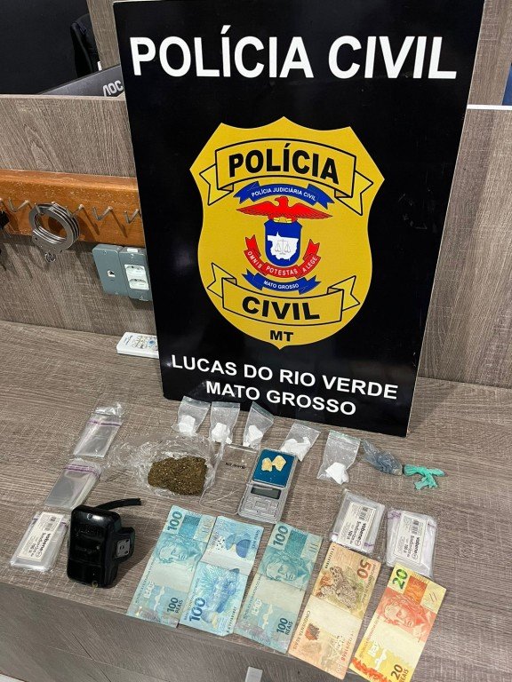 Em seguida ele foi conduzido até a Delegacia de Lucas do Rio Verde, onde foi interrogado, autuado em flagrante por tráfico de drogas e dado cumprimento ao mandado de prisão em aberto.