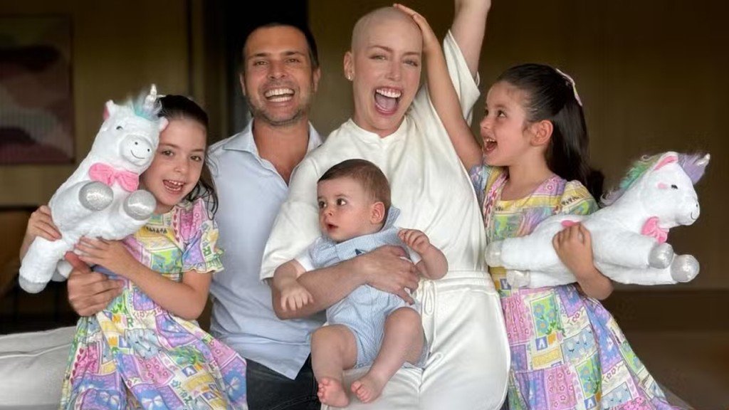 Fabiana Justus celebrou a notícia de que recebeu alta hospitalar nesta terça-feira (16). A influenciadora posou com os três filhos, Chiara e Sienna, de cinco anos, e Luigi, de cinco meses, alémdo marido, Bruno D’Ancona, em sua casa em São Paulo.