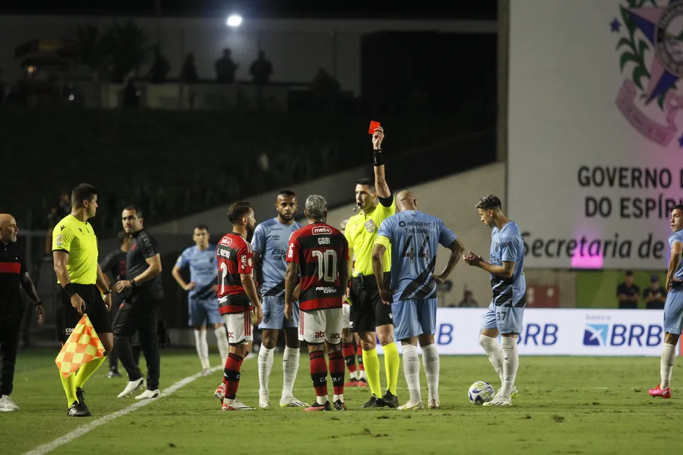 Gabigol foi expulso na derrota do Flamengo por 3 a 0 para o Athletico Paranaense, nesta quarta-feira, em Cariacica. O atacante rubro-negro levou cartão vermelho após dar uma braçada em Cuello, em lance revisado pelo VAR. Esse foi o 16º cartão do jogador no ano, a primeira expulsão.