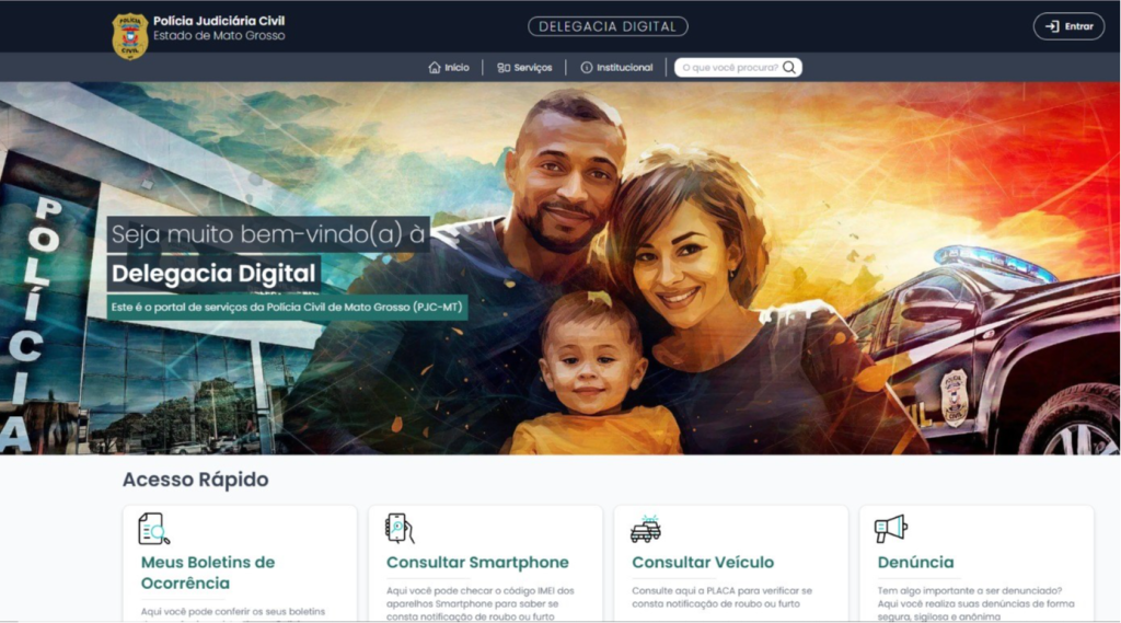 A Delegacia Digital reúne diversos serviços ofertados à população mato-grossense, como registros de boletins de ocorrências, consultas a veículos e telefones, solicitação de medidas protetivas, registros de pessoas desaparecidas, entre outras funcionalidades.