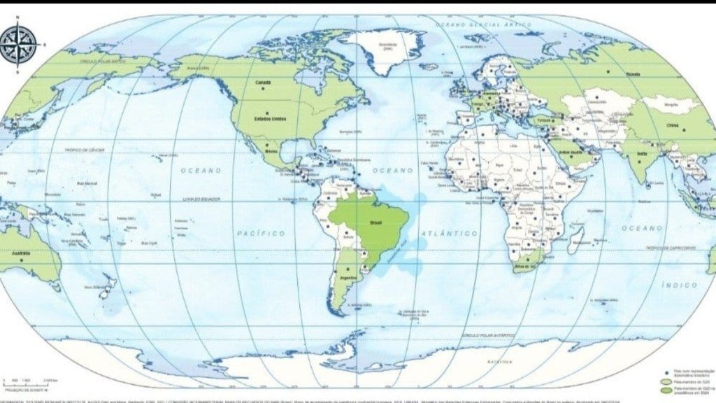 Os mapas também destacam os integrantes do G20, grupo presidido pelo Brasil em 2024, e as nações com representação diplomática brasileira.