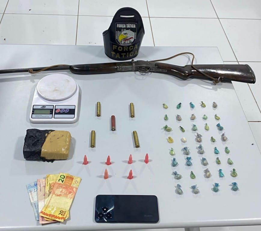 Policiais militares da Força Tática da 15ª Companhia Independente prendeu um rapaz de 20 anos, nesta terça-feira (23.01), e apreendeu 39 porções de cocaína, um tablete de maconha, uma espingarda calibre 36 e cinco munições, em Nobres.