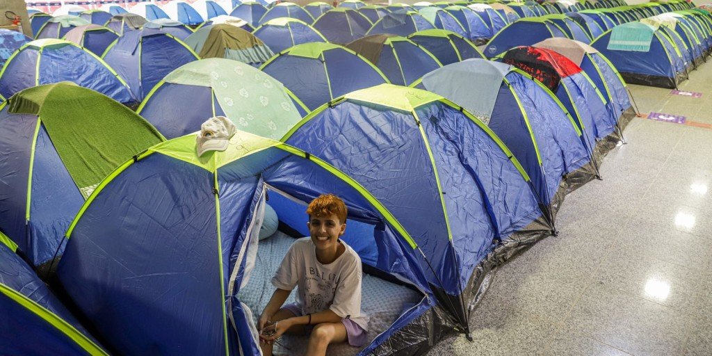 Um dos espaços mais frequentados das edições do Campus Party Brasil é o camping dos participantes do maior evento de tecnologia e cultura gamer do país. Na sexta edição do evento em Brasília, não é diferente. Os dois andares da varanda coberta do Estádio Mané Garrincha são os queridinhos dos chamados campuseiros, porque estão tomados por barracas de lona azul já montadas. Os participantes pagaram até R$ 469,15 para ocupar individualmente ou em dupla uma dessas barracas. Já os voluntários cadastrados para trabalhar no evento têm o direito de ocupar individualmente uma delas sem desembolsar nada.![]()