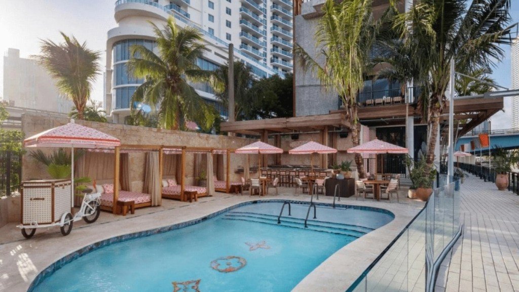 A área da piscina do hotel se transformou em um vibrante oásis de coral e fúcsia. O fundo da piscina agora exibe os florais icônicos da marca, complementados por uma gigantesca escultura de concha em forma de flor de diamante.