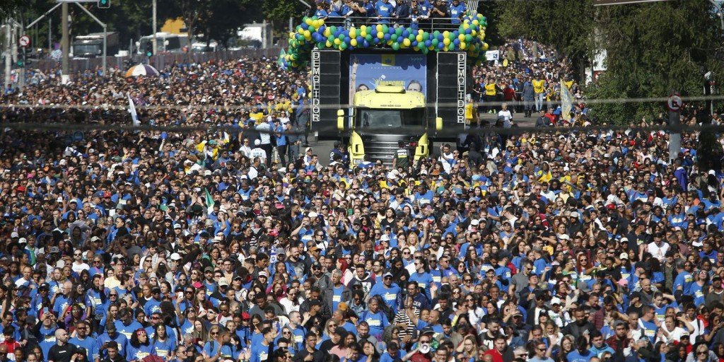 Acompanhado do apóstolo Estevam Hernandes, da Igreja Renascer em Cristo, o prefeito de São Paulo, Ricardo Nunes discursou de um carro de som. Dizendo estar feliz e emocionado, Nunes pediu orações pelas pessoas afetadas pela catástrofe climática no Rio Grande do Sul. “Que a gente possa colocar os nossos irmãos do Rio Grande do Sul em nossas orações, para que eles tenham de todos nós uma energia muito positiva”, conclamou o prefeito, que estava junto com a esposa, Regina.
