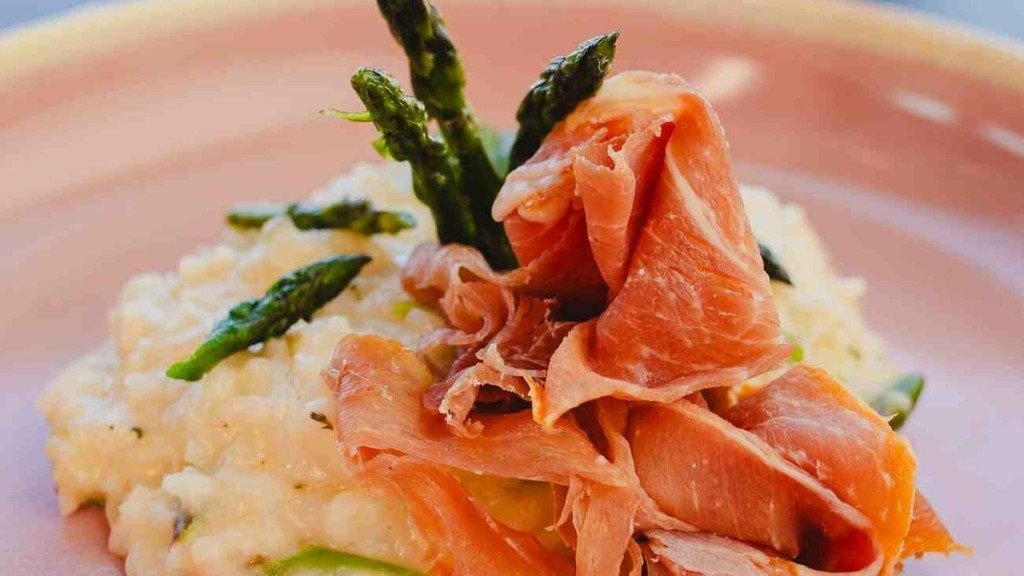 Cozido com caldo de aspargos e finalizado com queijo brie e presunto Parma, o risoto Clássico Ibérico harmoniza com o drinque Toranja (R$ 46), com espírito em Tequila Añejo, corpo em Aperol e toranja, equilibrado em castanhas e ruibarbo.
