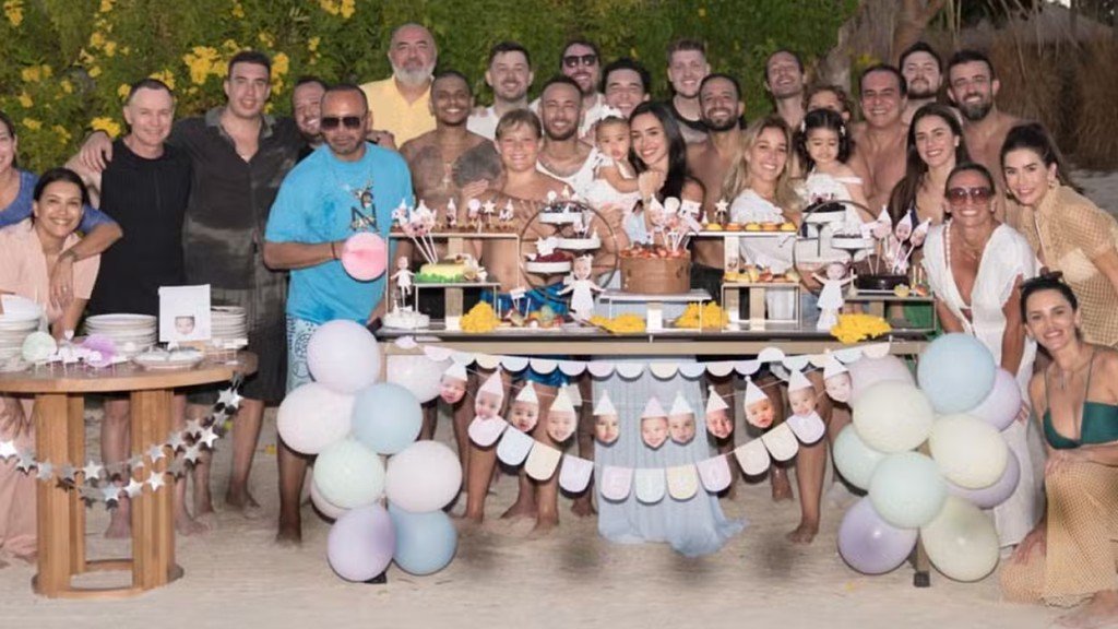 A festa intimista e simples de uma das herdeiras de Neymar aconteceu na praia, pé na areia, e a decoração foi inteiramente desenvolvida em uma mesa — que abrigou os docinhos e o bolo, aparentemente de chocolate com morango.
