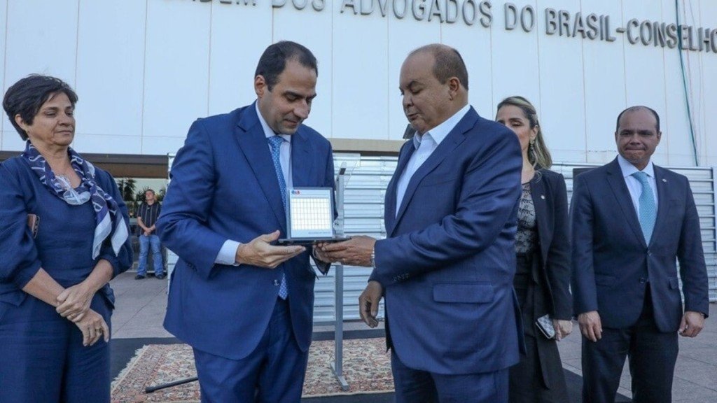O governador Ibaneis Rocha recebeu, nesta segunda-feira (19), um troféu de reconhecimento do Conselho Federal da Ordem dos Advogados do Brasil (OAB) pela solidariedade prestada durante o incêndio que atingiu o edifício-sede da entidade, em 27 de julho. A cerimônia também homenageou as cinco pessoas que estavam no edifício durante a ocorrência e as autoridades que atuaram no combate às chamas.