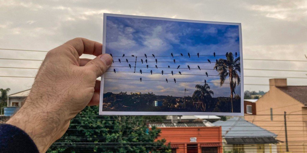“Minha ideia era fotografar com a máquina no chão, para pegar aqueles passarinhos se alimentando e dar a sensação de que eles eram maiores. Eu fiz isso. Só que quando eu olhei pra cima, nos fios, estava aquele montão de passarinhos esperando a sua vez de comer”, recorda-se o fotógrafo. Ele fez várias fotos dessa posição e reparou nos pássaros distribuídos nos fios como em uma pauta musical: “mas que estranho, parece uma partitura aquilo ali.”