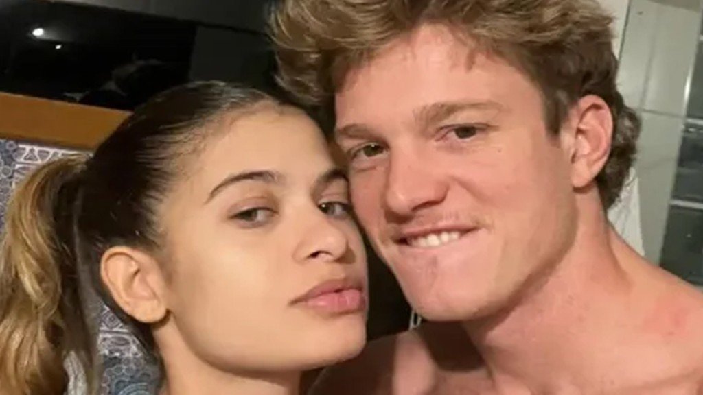 Nos cliques, o filho de Leticia Spiller e Marcello Novaes aparece abraçado com a jovem de 25 anos. Em um dos cliques, a moça surge completamente nua.