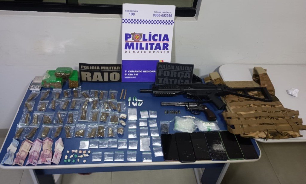 Equipes da 22ª Companhia Independente apreenderam, na noite desta quinta-feira (08.08), um simulacro de fuzil, um revólver, munições e 93 porções de entorpecentes, entre maconha e pasta base de cocaína em Sapezal (510 km de Cuiabá). Na ação, uma adolescente de 16 anos foi apreendida e dois homens, de 18 e 21 anos, foram presos suspeitos por tráfico de drogas e porte ilegal de arma de fogo.