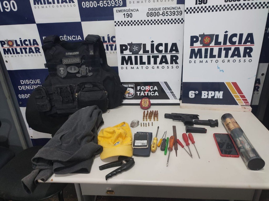 Alguns dos suspeitos foram localizados escondidos entre os quartos e o banheiro do imóvel. Durante busca domiciliar, foram apreendidas uma pistola 380 com 17 munições, cinco munições calibre 22, um kit de ferramentas, uma porção de maconha e um aparelho celular.