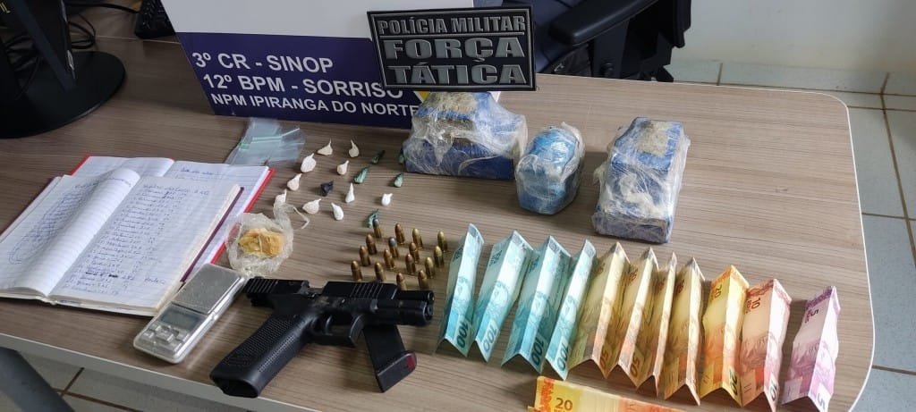 Os policiais encontraram uma pistola calibre 9 milímetro, 16 munições e diversas porções de drogas. Os suspeitos foram encaminhados à delegacia de Sorriso para registro do boletim de ocorrência.