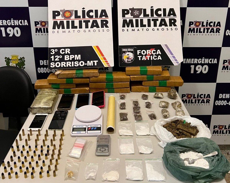 Policiais militares da Força Tática de Sorriso prenderam dois homens e duas mulheres e apreenderam uma adolescente por formação de quadrilha, tráfico de drogas e porte ilegal de arma, na noite desta quinta-feira (13.06). Com o grupo, a PM apreendeu 12 tabletes e porções de maconha, porções de cocaína e munições de diversos calibres.