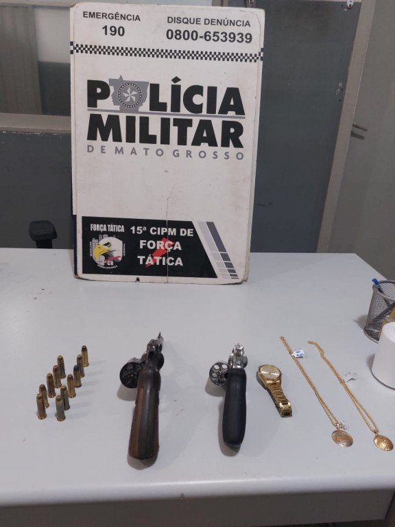 Equipes da Polícia Militar prenderam dois homens, de 26 e 46 anos, por roubo, desobediência e porte ilegal de arma, na tarde desta quinta-feira (07.03), em Várzea Grande. Duas correntes de ouro foram recuperadas e duas armas de fogo foram apreendidas.