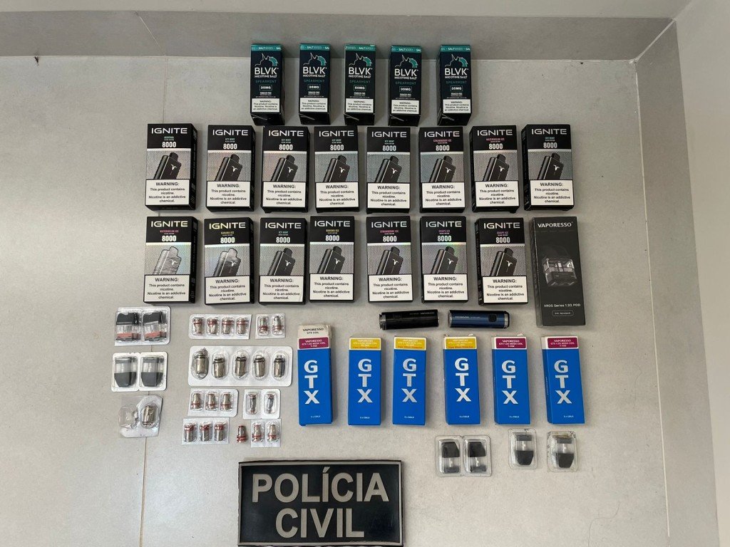 Durante buscas na tabacaria, localizada no bairro Sol Nascente, os policiais civis apreenderam 60 itens entre aparelhos de cigarro eletrônico, essências e refis. Todo material foi lacrado e encaminhado para perícia.