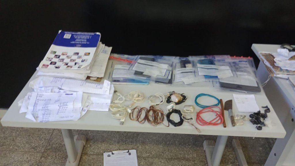 A ação resultou na apreensão de 13 aparelhos celulares, diversos carregadores, porções de drogas, entre maconha e cocaína, faca, cadernos de anotações, entre outros objetos, inclusive um mapa da cidade. ![]()
