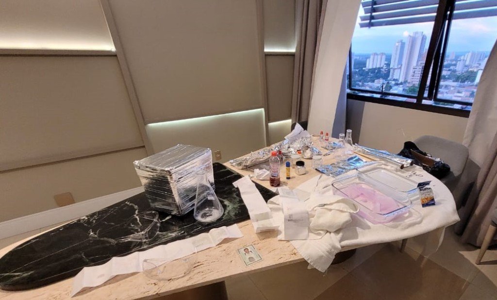 Simultaneamente, outra equipe policial seguiu até a suíte do hotel onde os investigados estavam e prendeu o terceiro envolvido. No quarto foi flagrado o laboratório improvisado para falsificação de papel-moeda e os pacotes de cédulas falsas.