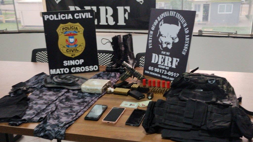Ao ser detido em Sinop, o criminoso apresentou identidade falsa. Ele mostrou aos policiais um documento de identificação em que constava sua foto, mas com um nome diferente. Em buscas na residência, a equipe da Derf localizou outra identidade falsa, além de munições de calibres 9mm, 12 e 38; uma pistola de 9mm adaptada, carregadores, lanterna, entorpecentes, uma máscara bala clava, roupas camufladas e colete.