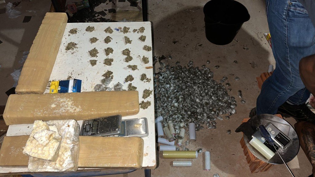 Os policiais militares se deslocaram ao local indicado e flagraram outras três pessoas manuseando grande quantidade de entorpecentes. As equipes flagraram ao todo, 1.185 porções de maconha e pasta base de cocaína.