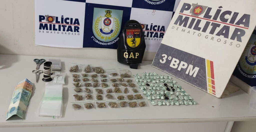 Policiais militares do 3º Batalhão apreenderam um adolescente de 17 anos com 118 porções de substâncias análogas à cocaína e maconha, em Cuiabá. O suspeito foi detido em flagrante, no bairro Centro América, nesta quinta-feira (07.03).