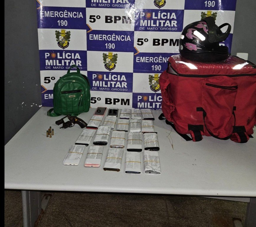 Após a denúncia, as equipes se deslocaram até o estabelecimento comercial e flagraram o suspeito saindo com capacete na cabeça, uma bolsa de entregador e uma bolsa verde em mãos.