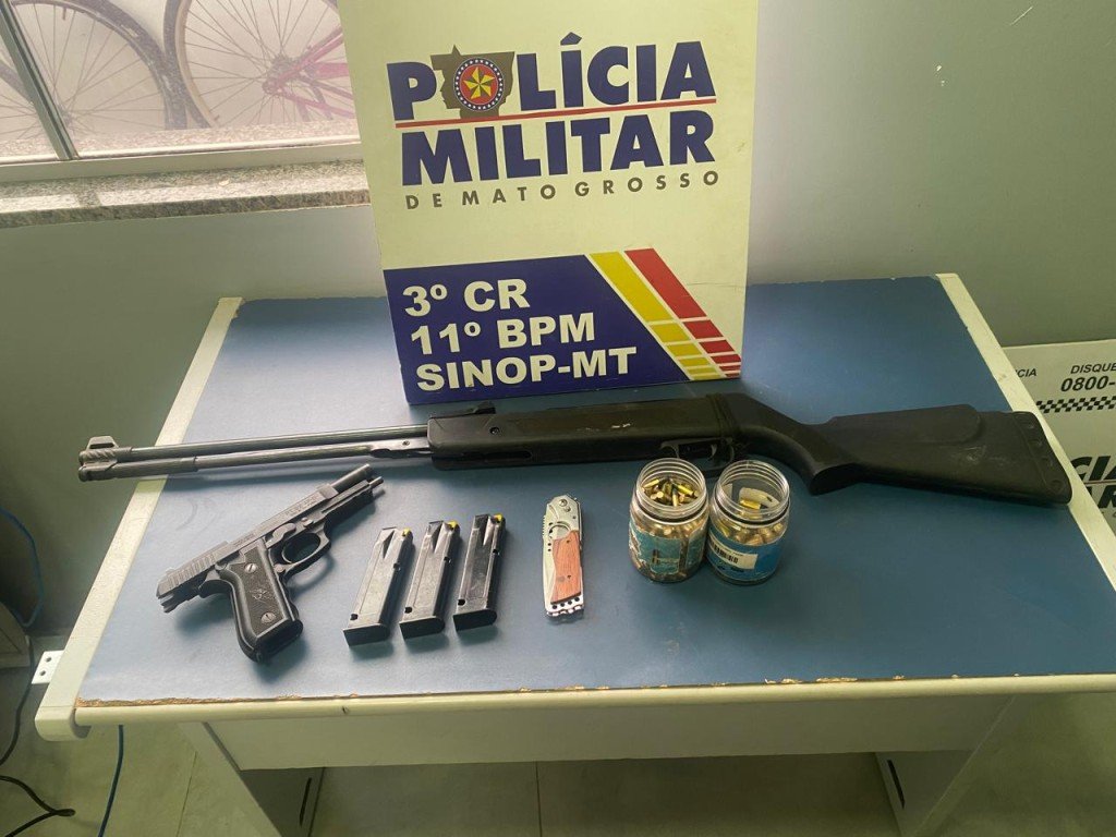 Diante da suspeita, os policiais realizaram busca veicular e localizaram um rifle de ar comprimido bloqueado para arma de fogo calibre 22 e uma pistola 9 milímetros.