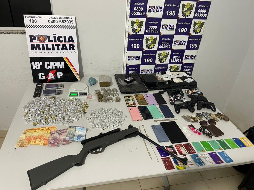 Policiais militares da 19ª Companhia Independente apreenderam 608 porções de maconha e prenderam três homens e uma mulher, nesta segunda-feira (05.08), suspeitos de associação criminosa, tráfico de drogas, roubo e receptação em Querência (764 km de Cuiabá). As equipes ainda recolheram uma espingarda de pressão, dez aparelhos celulares, cartões de crédito e aparelhos de videogames.