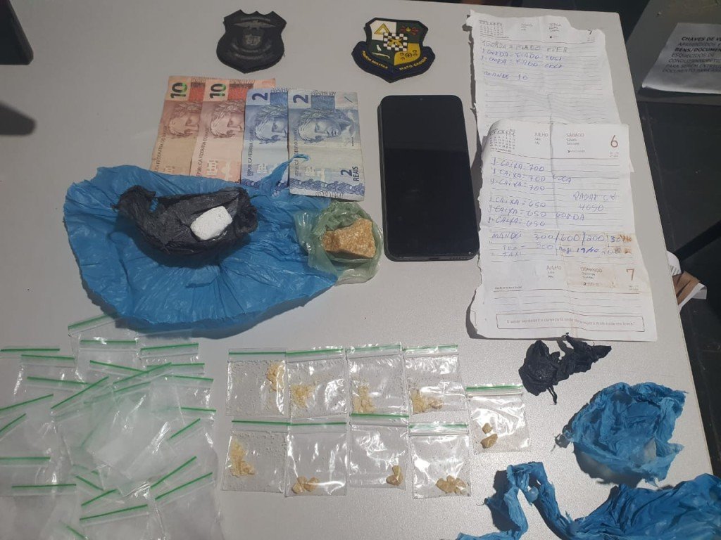 O suspeito, de 34 anos, foi autuado em flagrante por tráfico de drogas e ameaça no âmbito da violência doméstica e familiar. Com ele, foram apreendidas várias porções de pasta base de cocaína e dinheiro.