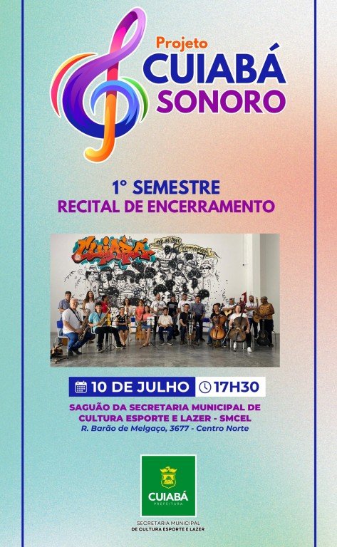 A Prefeitura de Cuiabá, por meio da Secretaria Municipal de Cultura, Esporte e Lazer, convida para o Recital de Encerramento do 1º semestre das atividades do Projeto Cuiabá Sonoro. O evento acontece nesta quarta-feira (10), a partir das 17h30, no saguão da Secretaria. A entrada é gratuita. O público terá a oportunidade de apreciar uma variedade de estilos musicais, todos apresentados pelos alunos do projeto.
