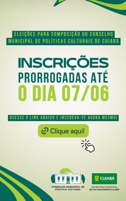 A Prefeitura de Cuiabá, por meio da Secretaria Municipal de Cultura, Esporte e Lazer informa que o período das inscrições para composição do Conselho Municipal de Política Cultural de Cuiabá, para o biênio 2024-2026 foi prorrogado até sexta-feira (07). Toda classe artística, produtores e técnicos culturais estão convidados a participarem do processo eleitoral. Para registro das inscrições, basta acessar o link- https://cmpc.cuiaba.mt.gov.br/votaculturapmc/com.votacultura.wportal.