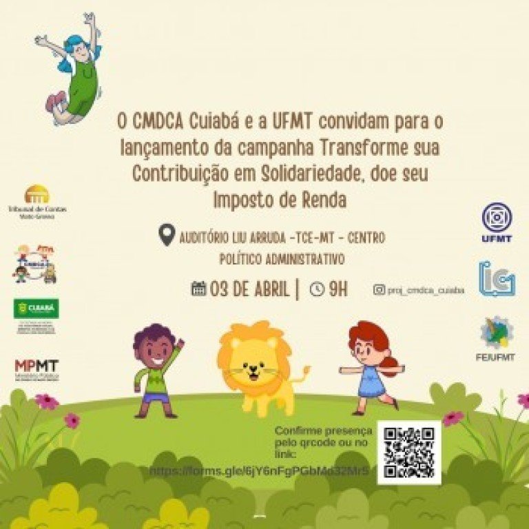 A Prefeitura de Cuiabá, por meio da Secretaria Municipal de Assistência Social, Direitos Humanos e da Pessoa com Deficiência é parceira da campanha “Transforme sua Contribuição em Solidariedade: Doe seu Imposto de Renda”, que será lançada nesta quarta-feira (03), no Espaço Cultural Liu Arruda, do Tribunal de Contas do Estado (TCE-MT), a partir das 9h. O evento é uma iniciativa do Conselho Municipal dos Direitos da Criança e do Adolescente de Cuiabá (CMDCA) e da Universidade Federal de Mato Grosso (UFMT), com entrada gratuita.