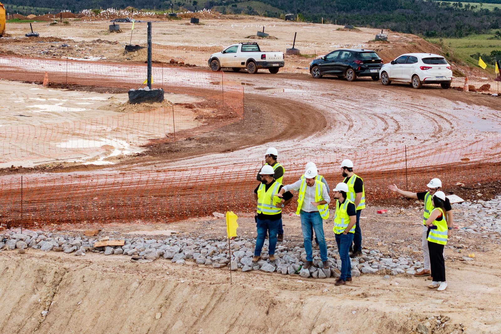 A imagem mostra o diretor-geral da Limpurb, Felipe Wellaton, ao lado de engenheiros da Limpurb e representantes da empresa Orizon, durante visita técnica ao Ecoparque Pantanal. Eles estão em área aberta do aterro sanitário, observando a estrutura e debatendo pontos técnicos da operação.
