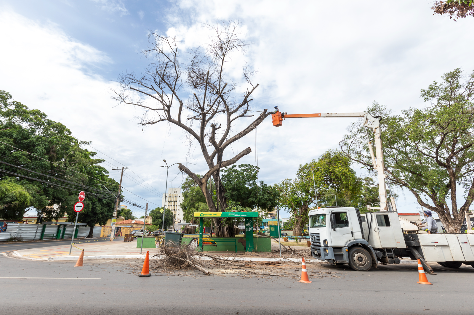 Na manhã de quarta-feira (29), equipes especializadas atuaram na erradicação de uma figueira localizada na Avenida Santos Dumont, na região central-sul de Cuiabá. O corte total da árvore foi realizado com base em um relatório técnico elaborado por engenheiros florestais e biólogos do Horto Florestal Tote Garcia, que identificaram o comprometimento estrutural da árvore, incluindo danos irreversíveis no cerne e no alburno, o que afetou a base do caule e comprometeu sua integridade e vida útil.