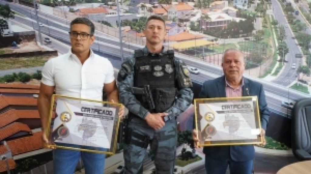O presidente da Câmara Municipal, vereador Chico 2000 (PL) e o vice-presidente, Rodrigo Arruda e Sá (Cidadania), receberam nesta quarta-feira (06.03), a Moeda Honorífica Mérito da Força Tática. A entrega foi realizada no gabinete da presidência pelo coronel Tiago Costa Gomes, da 15ª Companhia Independente de Força Tática, do 2º Comando Regional, de Várzea Grande.