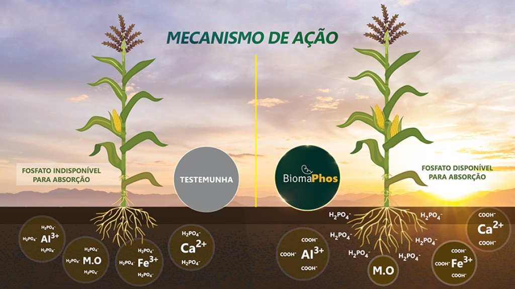 Como funciona – Apenas 0,1% do fósforo disponível no solo é absorvível pelas plantas. O BiomaPHOS atua liberando o elemento armazenado em formas insolúveis, graças a duas bactérias selecionadas pela Embrapa ao longo de 18 anos de pesquisa. O produto é aplicado diretamente nas sementes ou no sulco de plantio, e as bactérias, ao se multiplicarem na rizosfera, liberam substâncias que solubilizam o fósforo, tornando-o acessível às plantas.