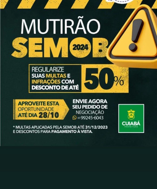 Termina nesta segunda-feira (28) o prazo para quitar débitos junto à Secretaria de Mobilidade Urbana (Semob) com até 50% de desconto. Quem possui débitos, incluindo multas e infrações registradas até 31 de dezembro de 2023, inscritas ou não em dívida ativa, pode aproveitar o Mutirão promovido pela Prefeitura de Cuiabá para regularizar a situação. Basta enviar uma mensagem para o WhatsApp (65) 99245-6043 e solicitar a negociação dos valores pendentes.